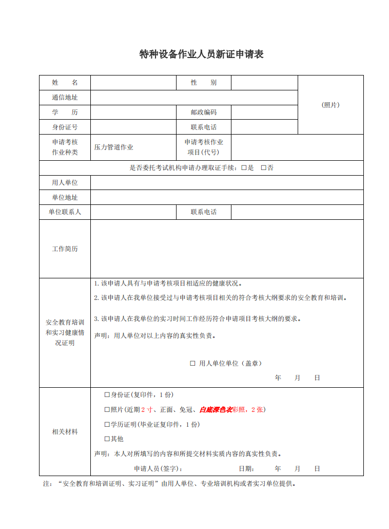 1、參加培訓(xùn)人員如實(shí)填寫特種設(shè)備作業(yè)考試申請(qǐng)表1份;