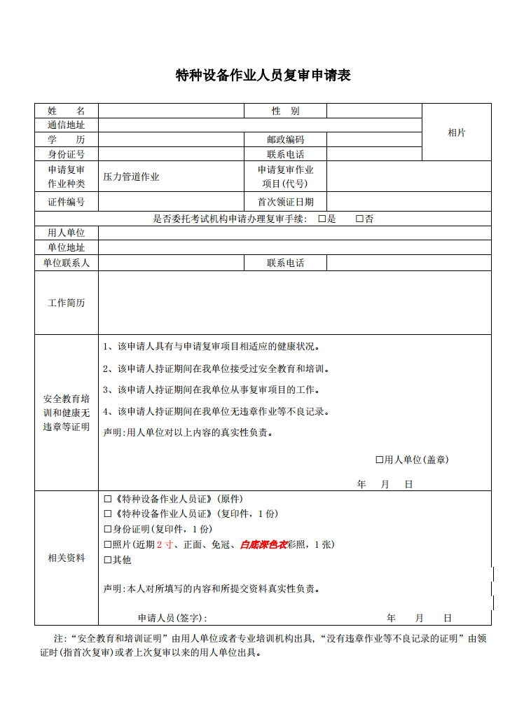 1、《特種設(shè)備作業(yè)人員復(fù)審申請(qǐng)》1份