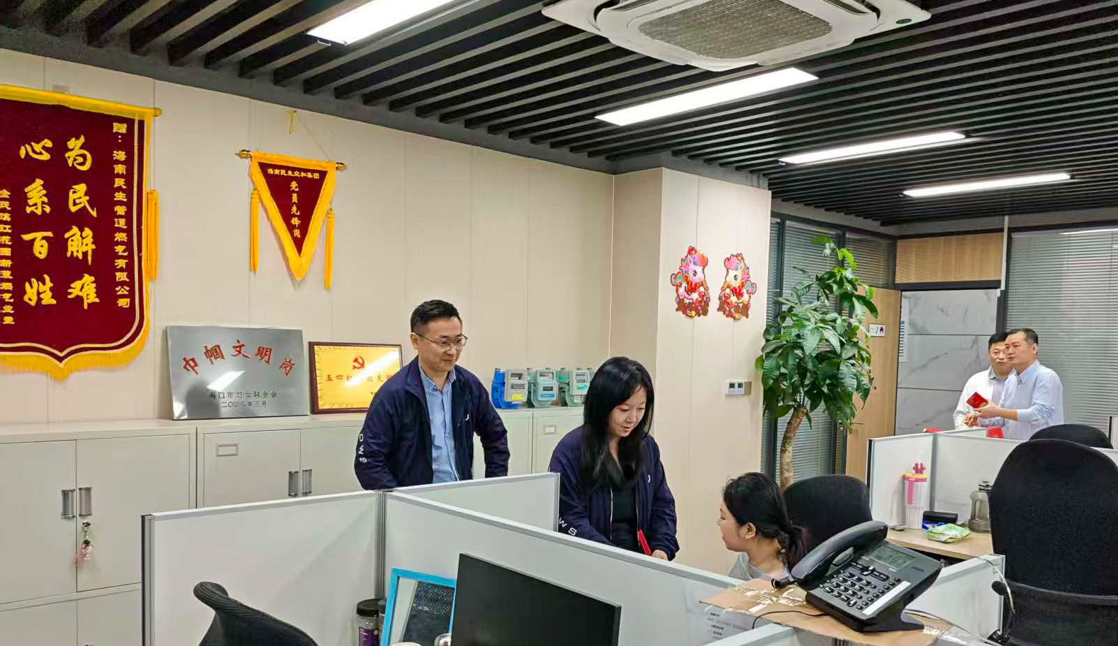 2月17日(大年初一)上午,海南民生眾和集團董事長萬明,集團執行董事、副總裁萬琳,海南民生燃氣總裁王奮,副總裁楊紅日及各分子公司領導,深入民生燃氣場站、值班點、話務中心及全球貿易之窗大廈等地,看望慰問節日期間仍堅守在一線的員工,檢查春節期間氣源保供及各項服務保障的開展情況,向大家致以馬年新春祝福。